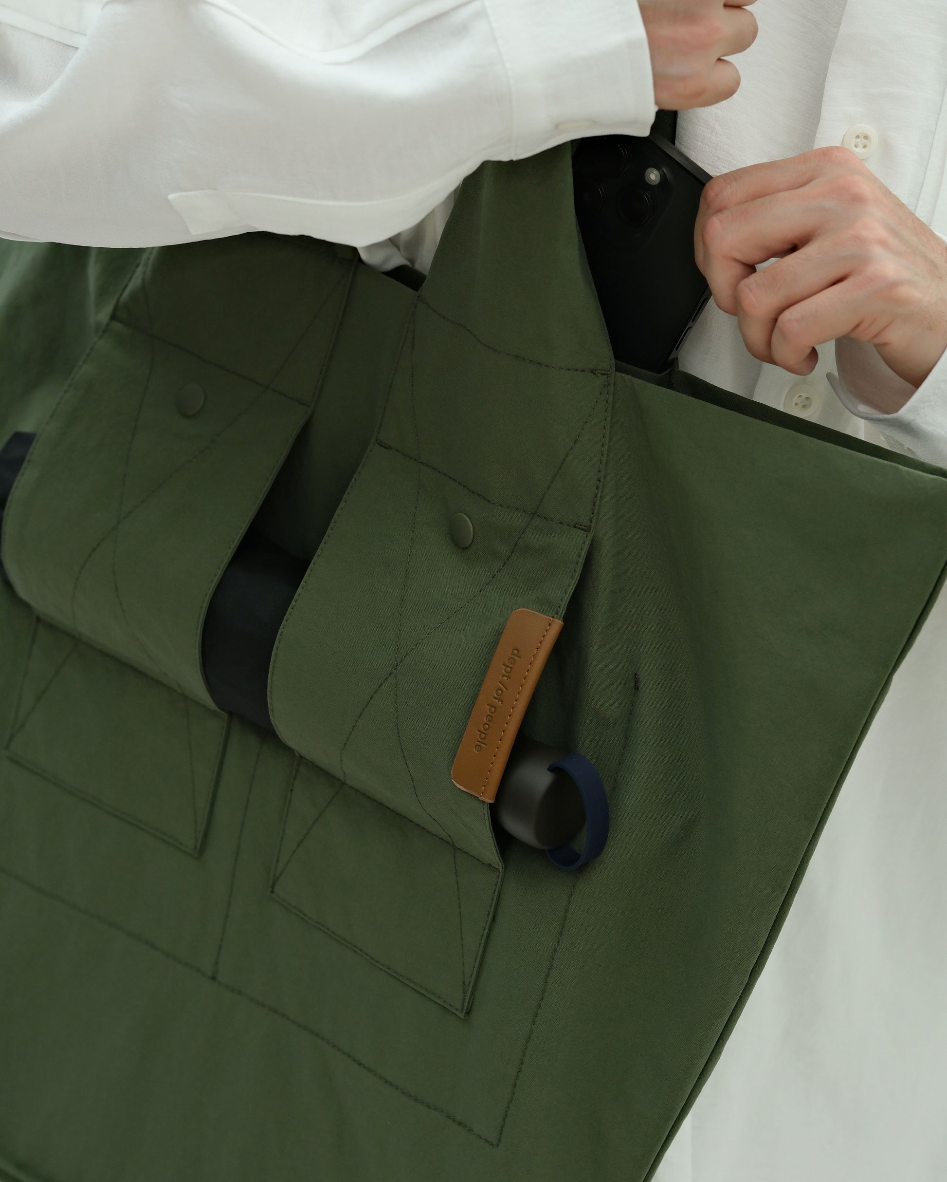 我們在袋身的側面,融入了一道隱形的「傘道」——並非顯眼的插袋,而是一條由手挽構成的收納軌跡。當你不需要它時,它只是袋側一條低調的線條;當雨天來臨,它便成為雨傘最安心的歸宿。