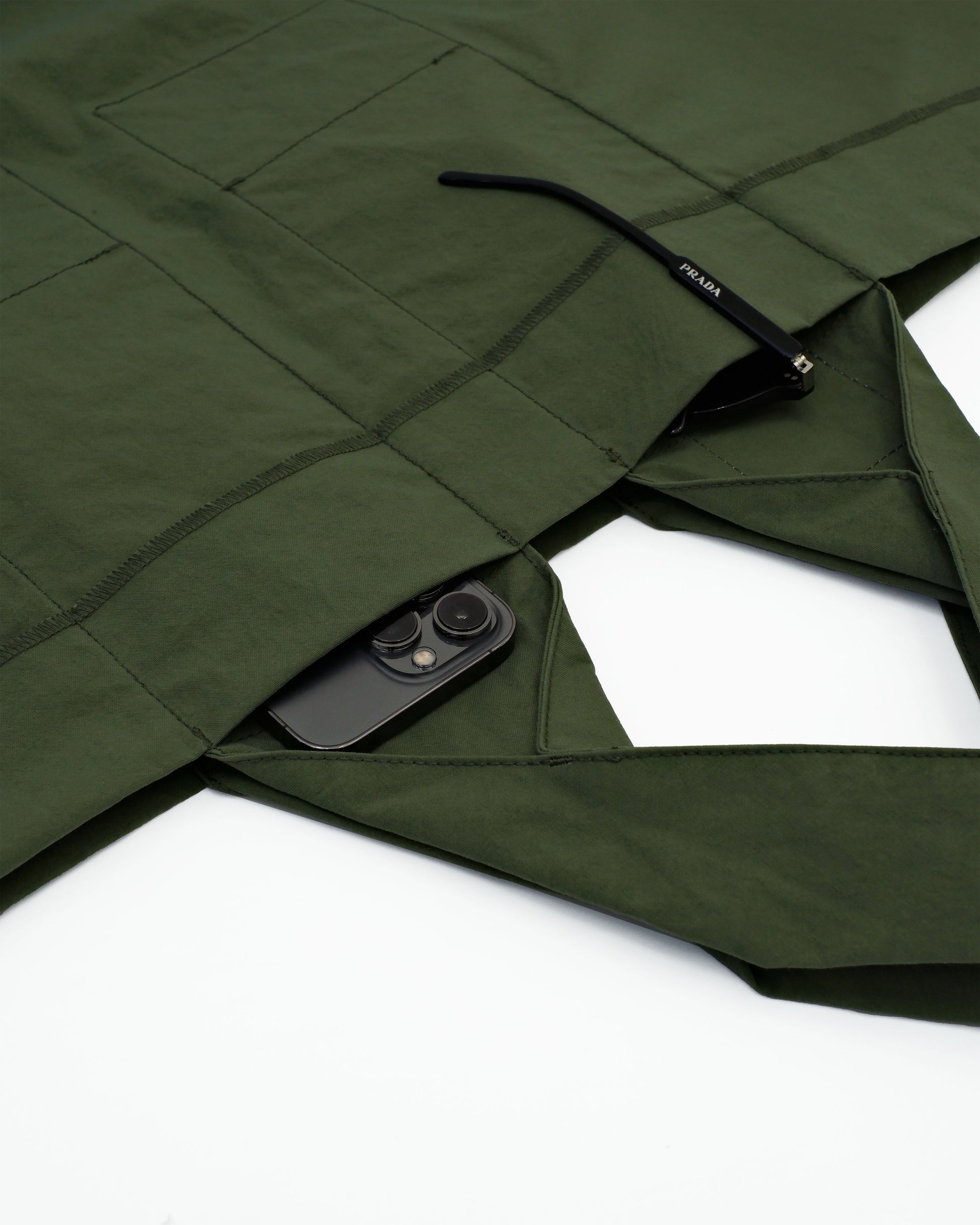 布料採用鹽縮加工的尼龍織布,這項高科技工序是將尼龍布料浸入中性鹽溶液中,使其產生收縮效果,特點是能在布料表面營造出自然的皺褶質感,呈現有機而不造作的紋理。在潮濕環境下,布料亦會變得更加柔軟。